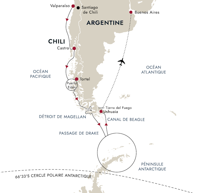 De Valparaíso, nous rejoindrons Castro et ses maisons sur pilotis colorées. De là, nous nous faufilerons dans les fjords chiliens et les voies navigables pittoresques de Patagonie, aux vues glaciaires époustouflantes et à la faune abondante. En chemin, nous rendrons visite à de petits villages isolés qui partageront avec nous leur vie au bout du monde.
