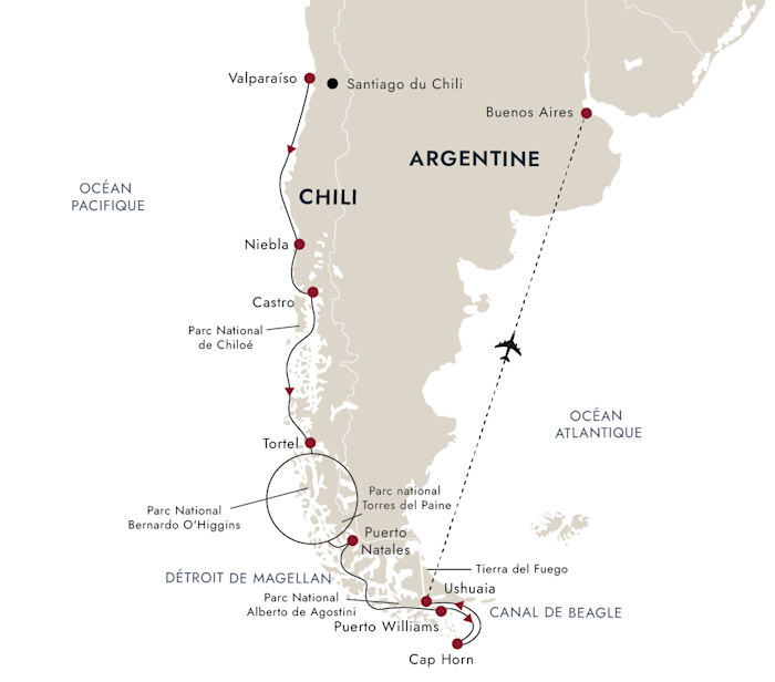 Au départ de Valparaíso, joyau de l’UNESCO situé au sommet d’une colline, nous naviguons vers le sud jusqu’à la pittoresque Niebla et la charmante Castro. En continuant le long de la côte ouest jusqu’à la Patagonie, vous admirerez des paysages panoramiques à couper le souffle et serez accueillis par des communautés isolées qui vous feront découvrir leur mode de vie. À Puerto Natales, vous aurez la possibilité de visiter le Parc National Torres del Paine, de renommée mondiale, avec ses imposantes montagnes de granit.