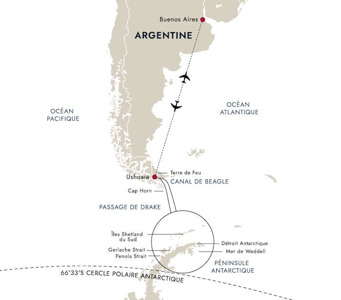Notre aventure commence dans le berceau argentin du tango, Buenos Aires, avant de nous envoler pour Ushuaïa, où nous attend notre confortable navire d’expédition à propulsion hybride. Grâce à l’équipe d’expédition, la traversée du Passage de Drake est un moment fort en apprentissage et en adrénaline. À notre arrivée, ce sont les îles Shetland du Sud, la mer de Weddell, ainsi que les détroits de l’Antarctique, de Gerlache et de Penola qui nous attendent. Les journées seront synonymes d’émerveillement, alors que nous contemplons d’immenses glaciers et icebergs, dans une aventure profondément enrichissante et hors du commun.