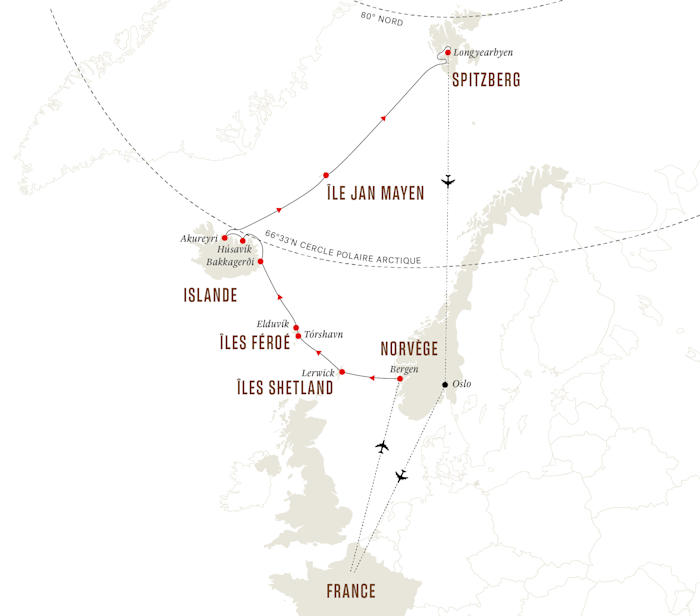 Notre aventure printanière débute à Bergen, en Norvège, avant de mettre le cap sur Lerwick, dans les îles Shetland écossaises. Nous voyagerons alors vers les verdoyantes îles Féroé, puis vers la côte nord de l’Islande. Notre croisière d’expédition s’achève à Longyearbyen, après l’exploration du splendide Spitzberg dans le Haut-Arctique, dans toute sa splendeur préservée.