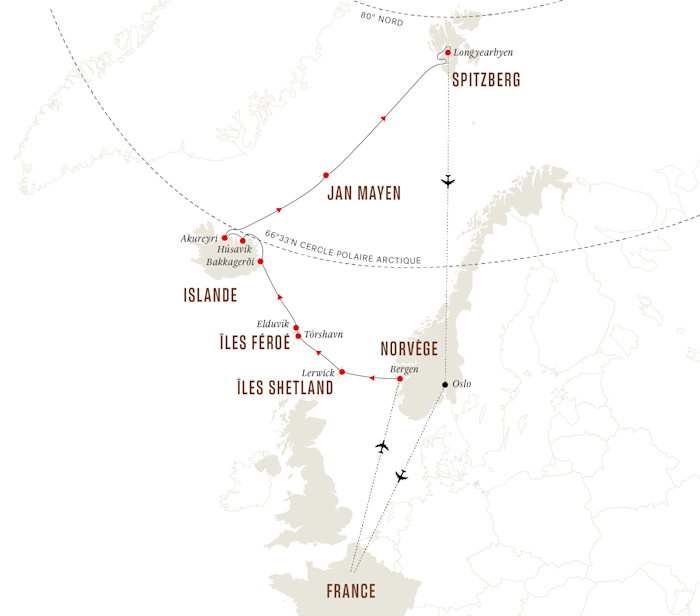 Notre aventure printanière commence à Bergen, en Norvège, pour ensuite naviguer jusqu’à Lerwick, dans les îles Shetland d’Écosse. De là, nous nous rendrons dans les verdoyantes îles Féroé, puis longerons la côte nord de l’Islande. Notre croisière d’expédition rejoindra ensuite les paysages immaculés du Spitzberg, dans le Haut-Arctique, pour prendre fin à Longyearbyen.