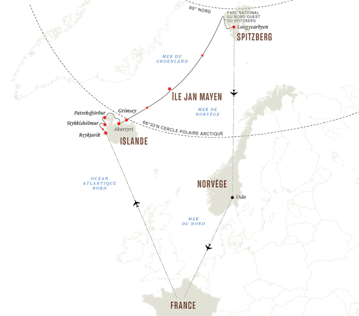 - Les vols Paris/Reykjavík et retour Longyearbyen/Paris (via Oslo) en classe économique, toutes taxes comprises (un supplément peut être appliqué au vol)