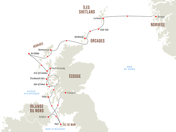 Rejoignez le MS Spitsbergen pour une splendide croisière d’expédition qui nous fera tout d’abord naviguer de l’Écosse vers Belfast et l’île de Man. Suivez la piste du whisky à Islay, tout aussi enivrante que son breuvage tourbé. De là, vous explorerez les magnifiques Hébrides extérieures, les Orcades aux influences vikings et les îles Shetland isolées avant de poursuivre vers Bergen.