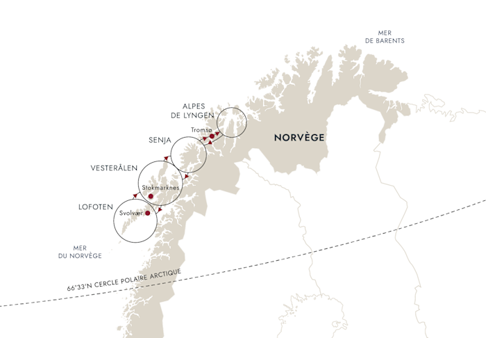Au départ de Tromsø, à l’aube de la nouvelle année, explorez quatre des régions les plus spectaculaires de la Norvège arctique : les Alpes de Lyngen, les îles Lofoten, Vesterålen et Senja. Vous découvrirez des montagnes enneigées, des fjords d’un bleu profond et de charmants villages de pêcheurs. Grâce à notre position en mer, nous espérons être aux premières loges pour assister au spectacle le plus extraordinaire de la nature : les Aurores Boréales de Norvège. Dans le silence des fjords, sous un ciel étoilé - ou éclairé par des Aurores Boréales -, vous trouverez l’espace nécessaire pour réfléchir, vous ressourcer et aborder la nouvelle année avec sérénité.