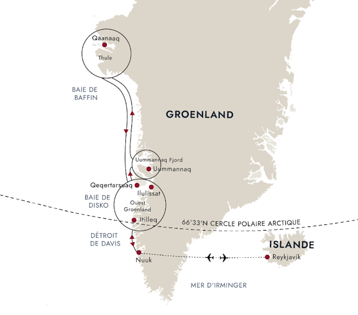 Ce voyage commence et se termine à Nuuk avec des vols au départ/à destination de Reykjavík. Une option pour prendre un vol au départ/à destination de Copenhagen à la place est proposée ici.
