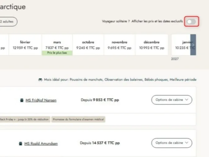 Nous avons facilité la recherche des meilleurs tarifs disponibles pour les personnes voyageant seules. Sur n'importe quelle page de voyage, faites défiler vers le bas jusqu'à la section « Départs » et activez le bouton « Vous voyagez seul ? ». Cela affichera automatiquement les réductions disponibles pour les personnes voyageant seules.