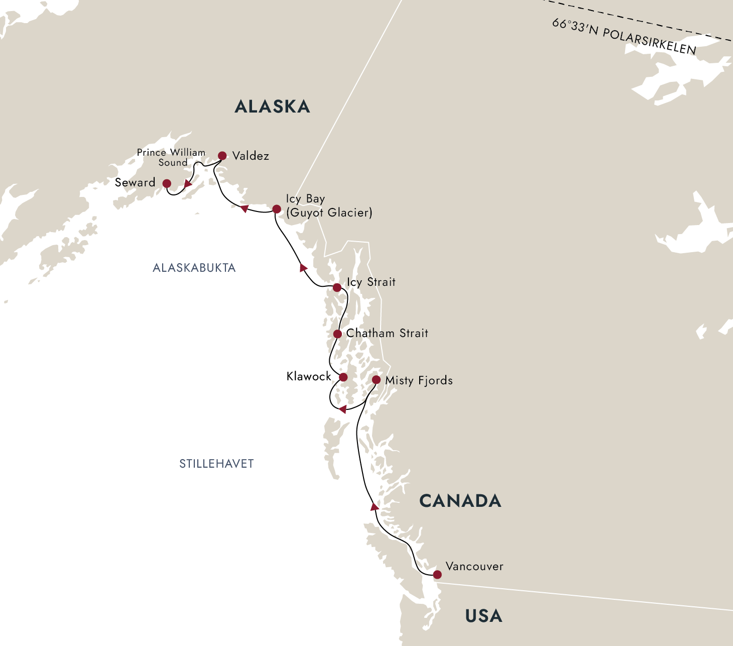 Bli med oss på et eventyr fra Vancouver til Seward, der vi seiler dypt inn i Prince William-sundet og viser deg majestetiske landskap, tradisjonell alaskisk kultur og dyreliv i tempererte regnskoger. Vi seiler gjennom Inside Passage og Alaskan Panhandle, som er kjent for sine dype fjorder, vakre isbreer og majestetiske fjell. Under seilingen vil vi holde utkikk etter hval og spekkhogger, i tillegg til landdyr som bjørn og elg.