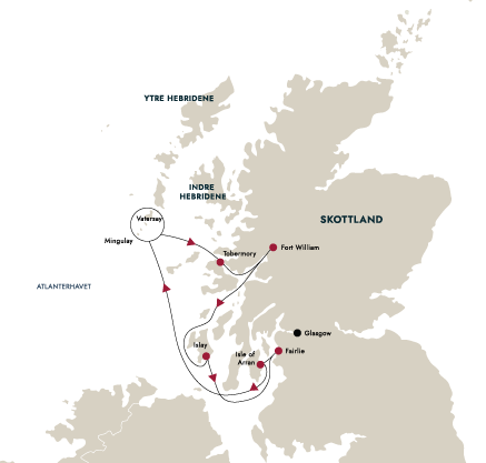 Fra Glasgow (Fairlie) seiler vi til de ville og avsidesliggende hebridiske øyene, hvor du får se kupert lynglandskap, hvite sandstrender og nydelige historiske byer. På vei mot Fort William kan du se forbløffende høylandslandskap bestående av skyhøye fjell og daler som er formet av isbreer.