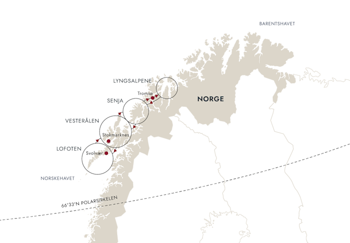 Vi setter seil fra Tromsø for å utforske fire utrolige regioner og oppleve magisk julestemning med snødekte landskap. Vi skal tilbringe en spennende uke med å oppleve de majestetiske isbreene i Lyngsalpene, dramatiske og vakre Lofoten, skogkledde fjell i Vesterålen og fredelige Senja. Og du skal få se hvite fjell, dype blå fjorder, sjarmerende bygder pyntet med julelys og – hvis du er heldig – det magiske nordlyset. På denne årstiden kan det i nord være helt mørkt, noe som gjør dette til en magisk tid for alle som vil oppleve en intim skandinavisk sjøreise og unik julestemning om bord.