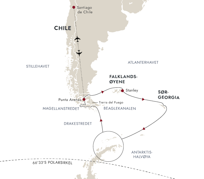 Vi seiler fra Chile for å utforske den unike og vakre verdenen i Sør-Georgia og Antarktis. Vi lar naturen styre ruten vår hver dag, og vi gjør det beste ut av de lokale forholdene. Du kan være sikker på at hver soloppgang byr på noe annerledes og spennende. I oktober og november begynner pingvinene å kurtisere og bygge reder på det syvende kontinentet. I desember og januar, gir sommeren lengre og mildere dager, mens i februar og mars, florerer det med hvaler og pingvinunger.