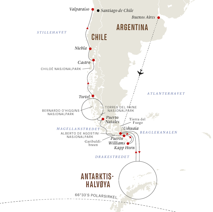 Eventyret ditt starter i Buenos Aires. Herfra går turen videre til Ushuaia, hvor du går om bord på ekspedisjonsskipet. Vi krysser Drakestredet og seiler inn i den hvite villmarken i Antarktis, hvor du får se svære isbreer og isfjell, og oppleve majestetisk natur. Vi skal seiler rundt islandskap som stadig endrer seg, og møte antarktisk dyreliv, som pingviner og hvaler.