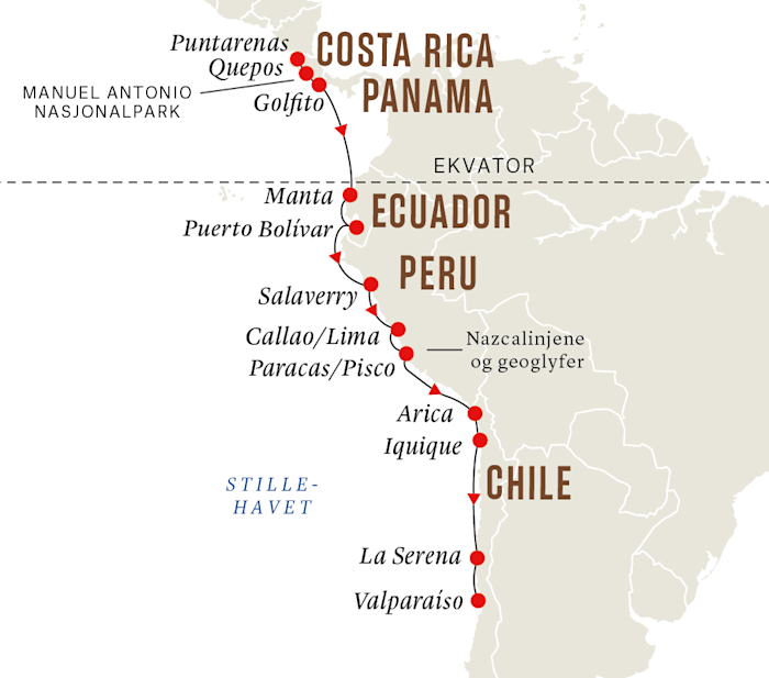 Første stopp i Peru er Salaverry, der du kan besøke det gamle tempelet og byruinene ved Trujillo. Deretter drar vi til koloniale Lima, en UNESCO-hovedstad med et overdådig mattilbud. Neste stopp er Paracas, hvor du kan besøke de biologisk mangfoldige Ballestas-øyene, deretter de solfylte feriebyene Arica og Iquique, den gamle kolonibyen La Serena og til slutt UNESCO-vernede Valparaíso. Dette vil være slutten på ekspedisjonen.