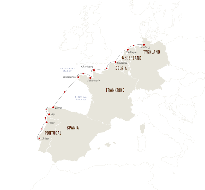 12-dagers ekspedisjonscruise fra Hamburg til Lisboa der vi utforsker Nederland, Belgia, Frankrike, Spania og Portugal.