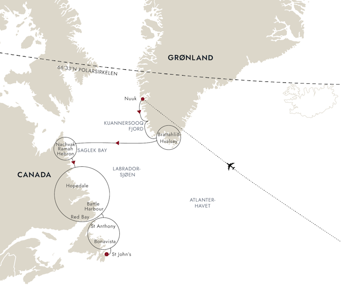 Fra Grønlands billedskjønne hovedstad Nuuk krysser vi Baffinbukta, issjøen som knytter sammen øst og vest, og kulturene i det arktiske Canada og Grønland. Dette omfattende ekspedisjonscruiset tar deg til de vakre sørlige fjordene på Grønland, de majestetiske Torngat-fjellene, de historiske tettstedene på Labrador-kysten, og sjarmerende Newfoundland. I ekte ekspedisjonsstil vil dagene fylles av ærefrykt og undring når vi går i land på noen av verdens mest avsidesliggende steder.
