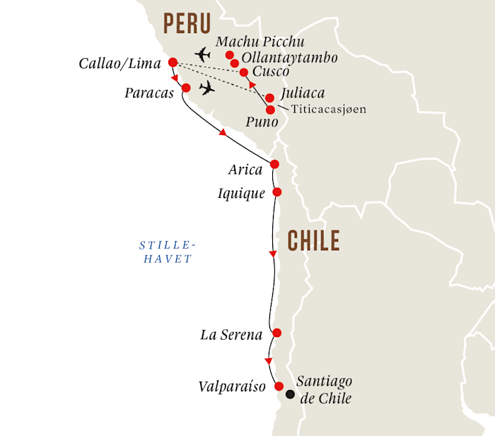 Når du setter seil går turen til Ballestasøyene, og her er det mange ville dyr og planter, eller du ser de gåtefulle nazcalinjene. I Chile kan du oppdage ørkenene i nærheten av Arica og Iquique, den klassiske arkitekturen til La Serena og den fargerike «stillehavetsjuvelen», Valparaíso.