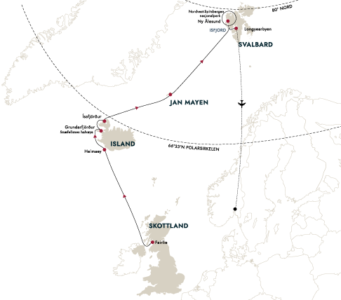 På ferden nordover drar vi til den avsidesliggende vulkanske øya Jan Mayen, som er et fristed for sjøfugler og hjem for havhest, polarlomvi og alkekonge. Og blant øyene på Svalbard får du utforske arktisk villmark der naturen bestemmer, og den majestetiske – men sky – isbjørnen vandrer rundt på den iskalde tundraen.