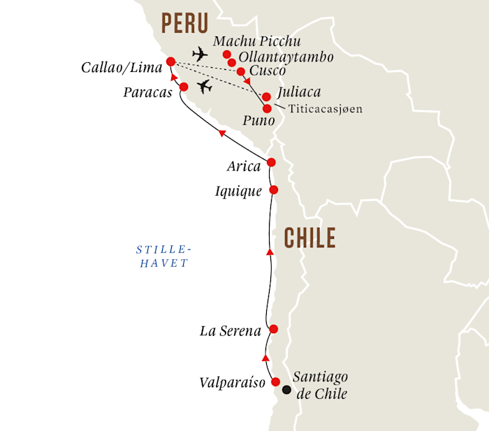 Fra Valparaíso, et sted på UNESCOs liste, reiser du til nykolonialismens La Serena og vakre Iquique, porten til Atacamaørkenenen. Videre går ferden til Aricas solrike strender før du får øynene opp for Stillehavskystens vidunderlige mangfold av ville dyr og planter på vei mot nord.