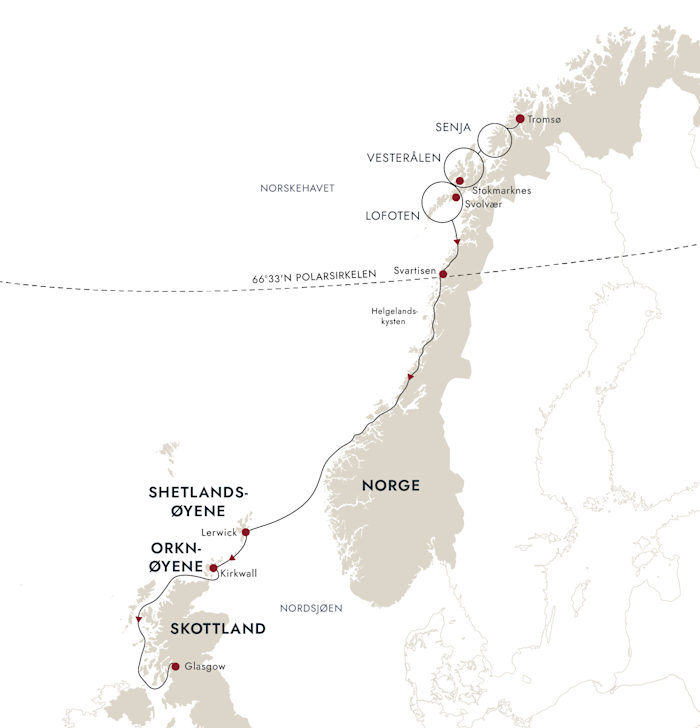 Vi kaster loss fra Tromsø og utforsker noen av landets mest spektakulære områder i den eventyrlige vintersesongen. I løpet av fem netter nord for polarsirkelen får du oppleve vakre og dramatiske Lofoten, de skogkledde fjellene i Vesterålen, stillheten på Senja og det storslåtte synet av Svartisen. Dette er tiden for snøkledde fjell, dypblå fjorder og kanskje også nordlyset. Senere krysser vi Norskehavet til Skottlands forblåste og historierike nordlige øyriker, Shetland og Orknøyene.