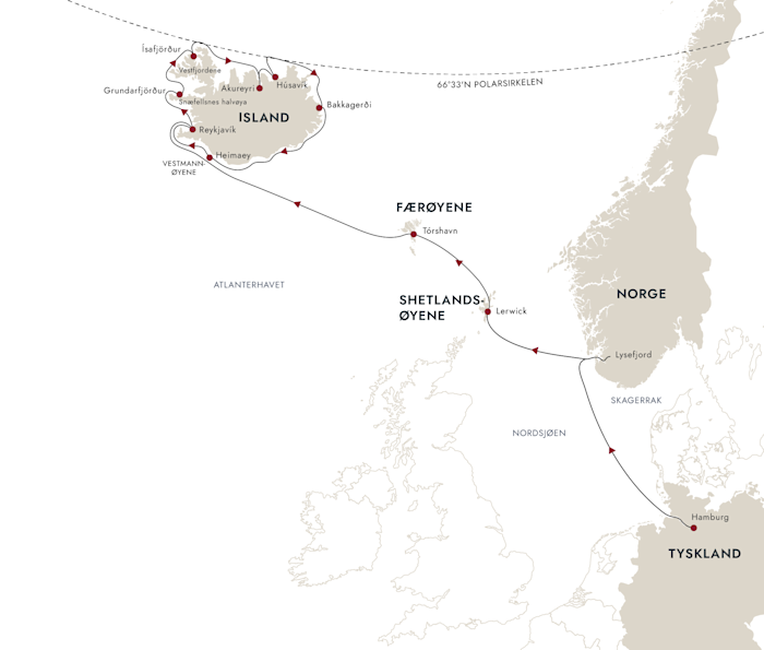 Vi kaster loss i Hamburg og seiler ut i Nordsjøen, med kurs for Island. Første stopp er den vakre Lysefjorden i Norge, før vi seiler ut på havet igjen for å besøke Orknøyene, Shetlandsøyene og Færøyene på reisen nordover. Disse ville og dramatiske øyene er forrevne og grønne, men stedet har en fascinerende historie og de som bor her er gjestfrie.