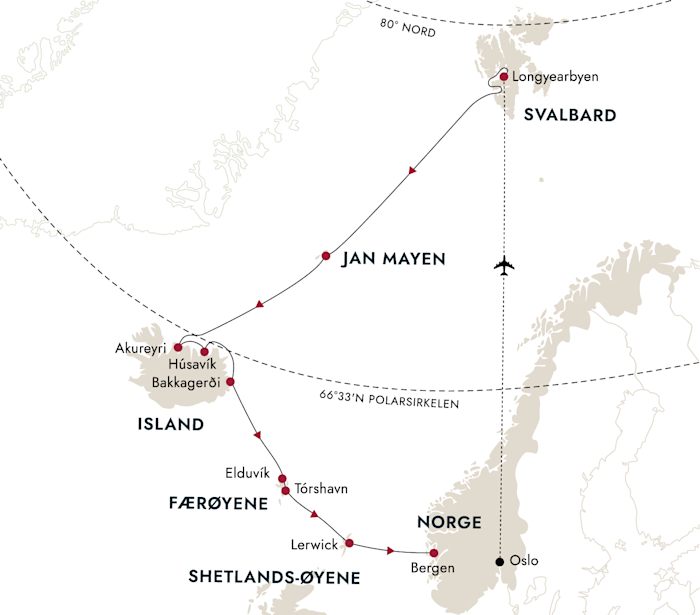 Fly fra Oslo til Longyearbyen på Spitsbergen, for å bli med på ekspedisjonscruise der blant annet reinsdyr, fjellrev, hvalross og den flyktige isbjørnen holder til. Senere kan du oppleve de vulkanske landskapene på Island, og se etter hvitnebbdelfin, nise, knølhval og vågehval.