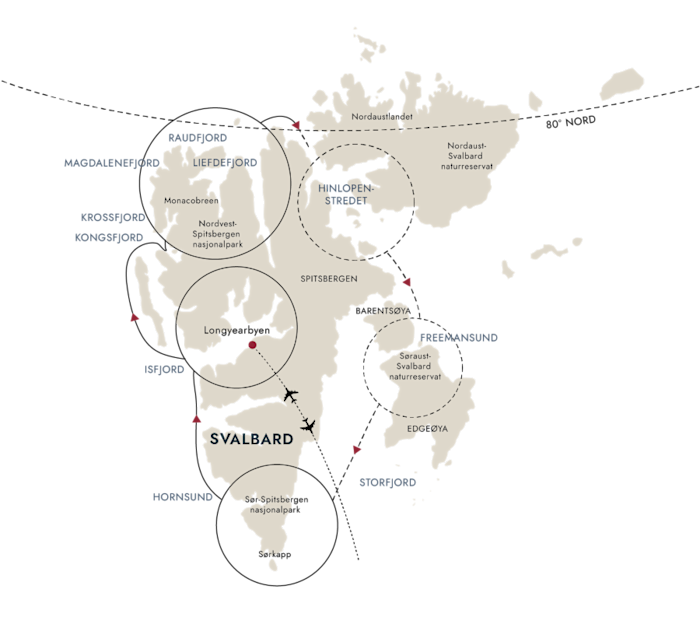 På dette episke ekspedisjonscruiset forsøker vi å finne en vei gjennom sjøisen, og krysser den 80. breddegraden. Hvis isforholdene tillater det, er målet å seile rundt Spitsbergen, slik at du kan oppleve fantastisk arktisk dyreliv og nydelig natur.
