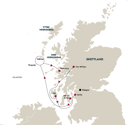 Res från Glasgow (Fairlie) till avlägsna öar i Hebriderna som bjuder på allt från fascinerande djur, kultur och historia till aktiviteter som tar dig nära naturen. Vi går iland på stränder, gör guidade vandringar, paddlar kajak och mycket mer när vi utforskar dessa orörda öar.