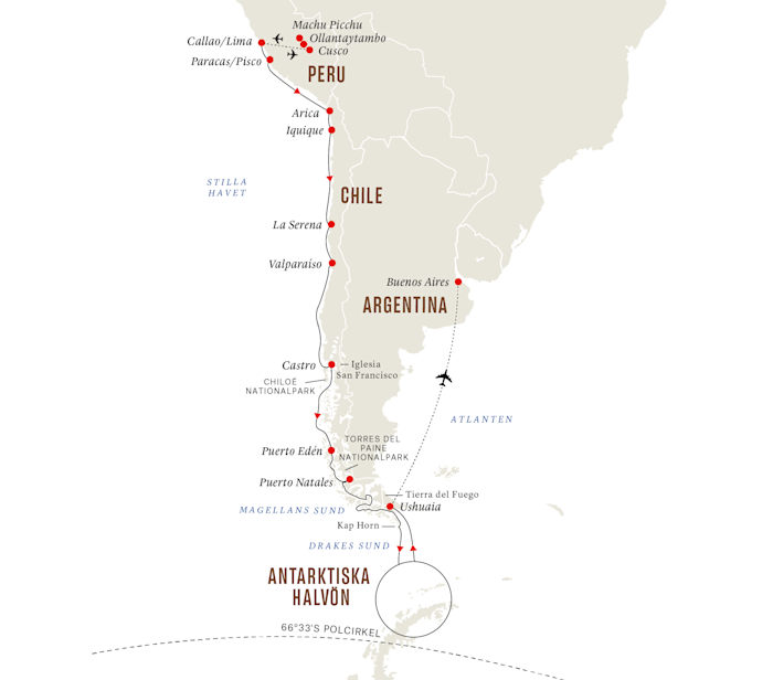 Vi fortsätter söderut och utforskar den färgstarka och Unesco-listade staden Valparaiso innan vi beger oss till Patagonien. Fartyget passerar vidsträckta fjordar, karga berg och isberg och lägger till i charmiga Castro, isolerade Puerto Edén och hisnande vackra Puerto Natales. Vi går genom Beaglekanalen till Sydamerikas södra spets, och om vädret tillåter gör en landstigning på Kap Horn.