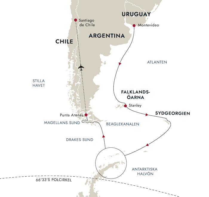 Vår expeditionskryssning till Antarktis når sitt slut i Punta Arenas. Härifrån kan du ta flyget tillbaka till Santiago de Chile och vidare hemåt med mängder av fantastiska minnen i bagaget.