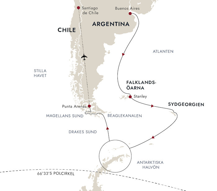 Vintersnön ligger kvar, i vattnet glittrar de storslagna isbergen och på land är pingvinerna i full färd med att uppvakta varandra och häcka. I Antarktis gör vi flera landstigningar för att uppleva den frusna kontinenten på nära håll. Vår resa avslutas i Patagonien i Chile.