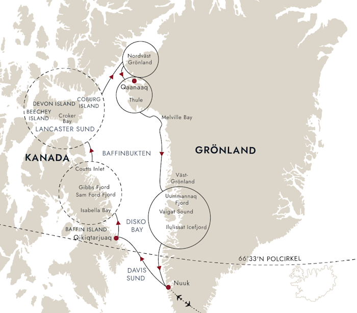 När du har flugit in från Reykjavík börjar upptäcktsresan i Nuuk. På den här omfattande expeditionskryssningen får du upptäcka naturliga underverk i fyra arktiska regioner; Baffinöns vindpinade östkust, Devonöns azurblåa stränder, nordvästra Grönlands dramatiska fjordar och den häpnadsväckande Diskobukten i västra Grönland.