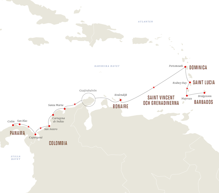 13 dagar lång expeditionskryssning från Colón till Bridgetown där vi utforskar Panama och Colombias karibiska kuster samt Små Antillerna