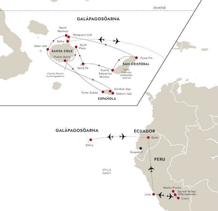 Den första delen av vårt äventyr sker på land. Vi lämnar Perus pulserande huvudstad Lima och flyger till inkarikets hjärta, Cusco, innan vi fortsätter upp till den heliga dalen ombord på ett lyxtåg och kommer fram till mytomspunna Machu Picchu. Besök ett traditionellt andinskt samhälle där uråldriga traditioner lever vidare, innan vi återvänder till Cusco för att utforska stadens kulturella och arkitektoniska sevärdheter. Därefter flyger vi till Ecuador och charmiga Quito, som brukar kallas ”staden med evig vår”.