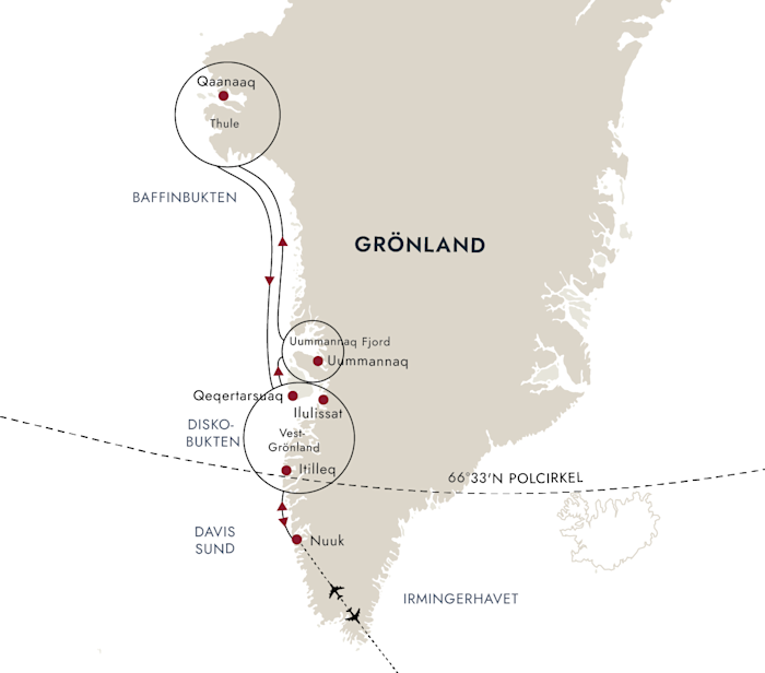 Vi kan komma att besöka små, avlägsna samhällen som Uummannaq, som omges av ett hjärtformat berg, eller Ukkusissat. Om vädret och isen tillåter utforskar vi Qilakitsoq, åker in i dolda fjordar eller går iland för att ta in Grönlands råa arktiska landskap – vi anpassar oss alltid efter naturens villkor.