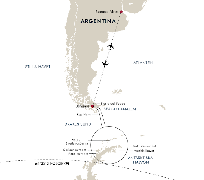 Vårt äventyr börjar i Buenos Aires, tangons födelsestad. Efter en flygresa till Ushuaia väntar ombordstigning på vårt bekväma och hybriddrivna expeditionsfartyg. Under resan genom Drakes sund växer spänningen medan expeditionsteamet berättar mer om regionen på väg mot Antarktiska halvön. Vid ankomst utforskar vi Sydshetlandsöarna, Weddellhavet, Antarcticsundet och sunden Gerlache och Penola. Här väntar dagar fyllda av häpnadsväckande naturupplevelser när vi blickar ut över vidsträckta glaciärer och isberg och ger oss ut på händelserika, unika äventyr.