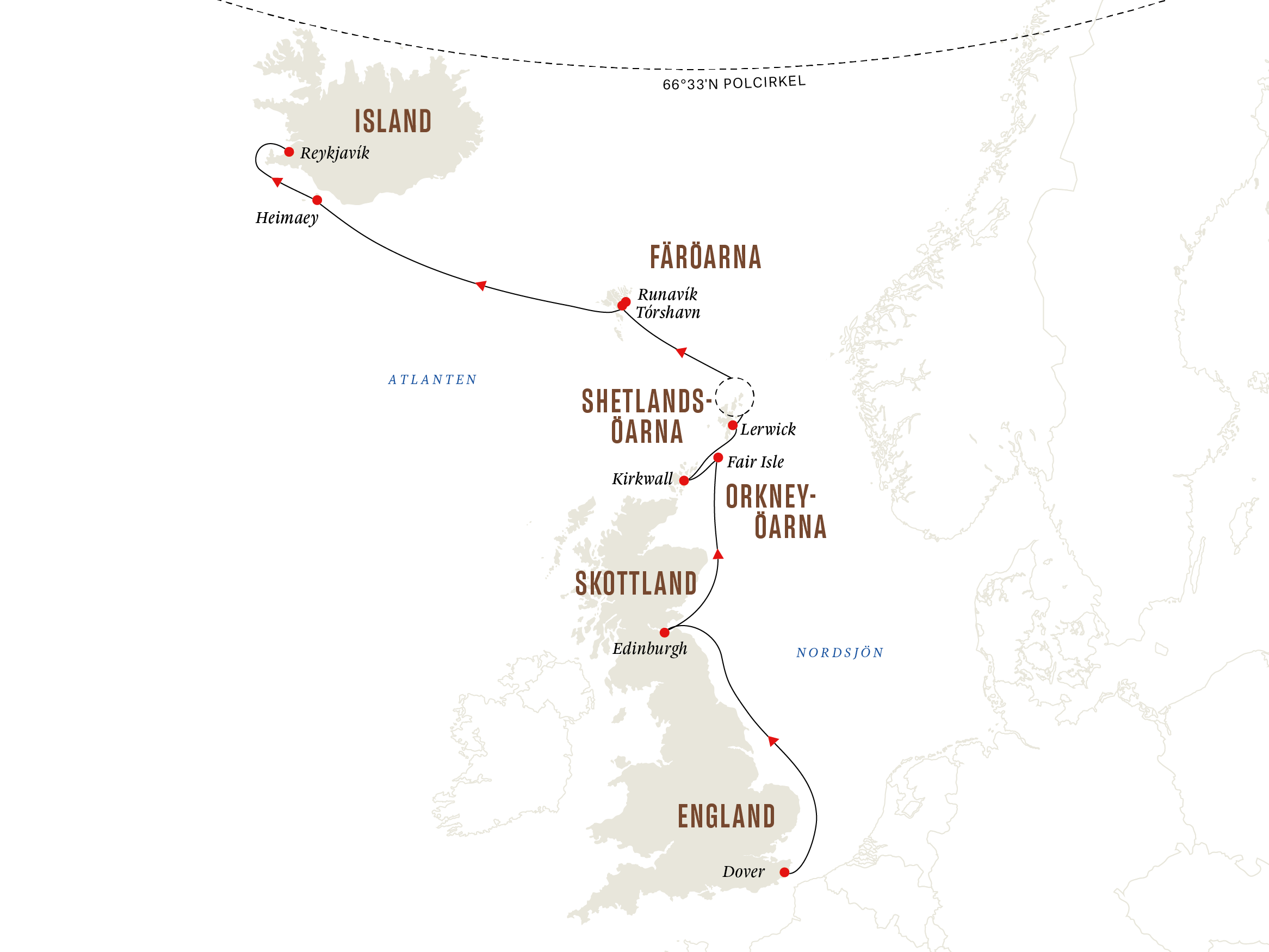 Res till den isländska huvudstaden från Dover via avlägsna och vilda öar i Nordatlanten. Utforska spännande huvudstäder, stenåldersplatser, blomstrande öar och små byar med influenser från vikingatiden medan sommarsolen värmer upp dessa vatten.