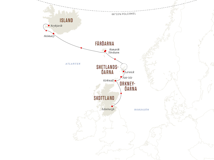 Res till den isländska huvudstaden från Edinburgh via avlägsna öar i Nordatlanten. Utforska spännande huvudstäder, stenåldersplatser, blomstrande öar och små byar med influenser från vikingatiden medan sommarsolen värmer upp dessa vatten.