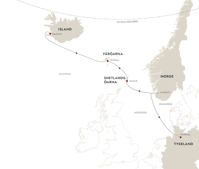 Äventyret börjar i den livliga tyska hamnstaden Hamburg och avslutas i moderna Reykjavík. Vi lämnar alla storstäder bakom oss, men får istället uppleva småstäderna och samhällena på öarna i Nordatlanten under resans gång. Och vi får förstås även njuta av den vackra naturen och spana efter vilda djur. Väl framme i Reykjavík kan resan med fördel kombineras med en av våra Islandsexpeditioner, till exempel en rundresa.