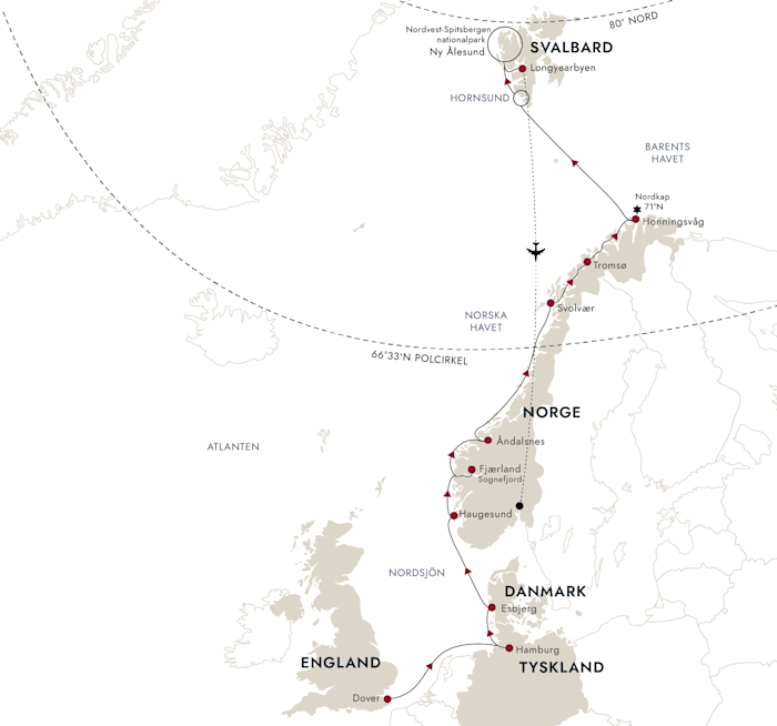 Färdas från Dover till Longyearbyen, upptäck dramatiska kuster och få vårkänslor i Nederländerna, Tyskland, södra Norge och Svalbard.