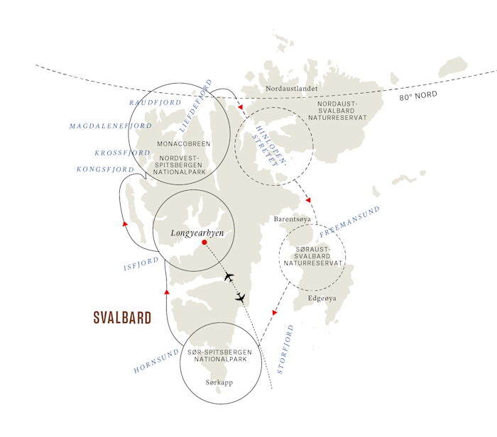 Ditt äventyr börjar med två nätter i Longyearbyen, staden högst upp på jordklotet. Sedan beger vi oss till Nordvest-Spitsbergen nationalpark Insup den häpnadsväckande arktiska naturen medan vi spanar efter isbjörn, fjällräv och svalbardsren. Vi får även möjlighet att se kolonier av spetsbergsgrisslor och tretåiga måsar.