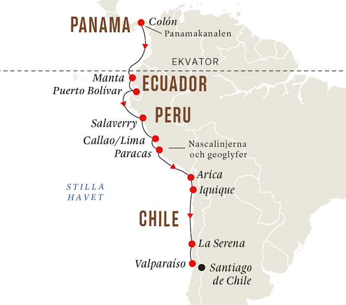 Vår kryssning längs Stillahavskusten fortsätter mot Peru. Ta in de vackra vyerna ute på däck, njut av den utsökta maten ombord eller passa på att utnyttja fartygets alla bekvämligheter.