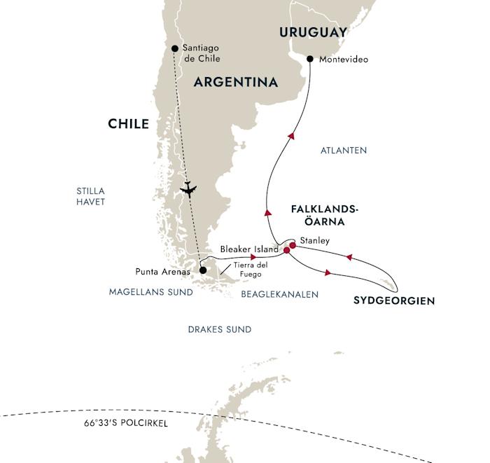 Resan fortsätter till Sydgeorgien, där vi anländer mitt i en livlig period för djurlivet. Pingviner och sjöfåglar avslutar just sin häckningssäsong, medan elefantsälar och pälssälar fortfarande är aktiva längs kusterna. Knölvalar, späckhuggare och andra valar syns ofta längs vägen. Vi får njuta av landstigningar och vandringar i det storslagna landskapet innan vi beger oss till en annan del av Falklandsöarna och seglar norrut mot Montevideo.